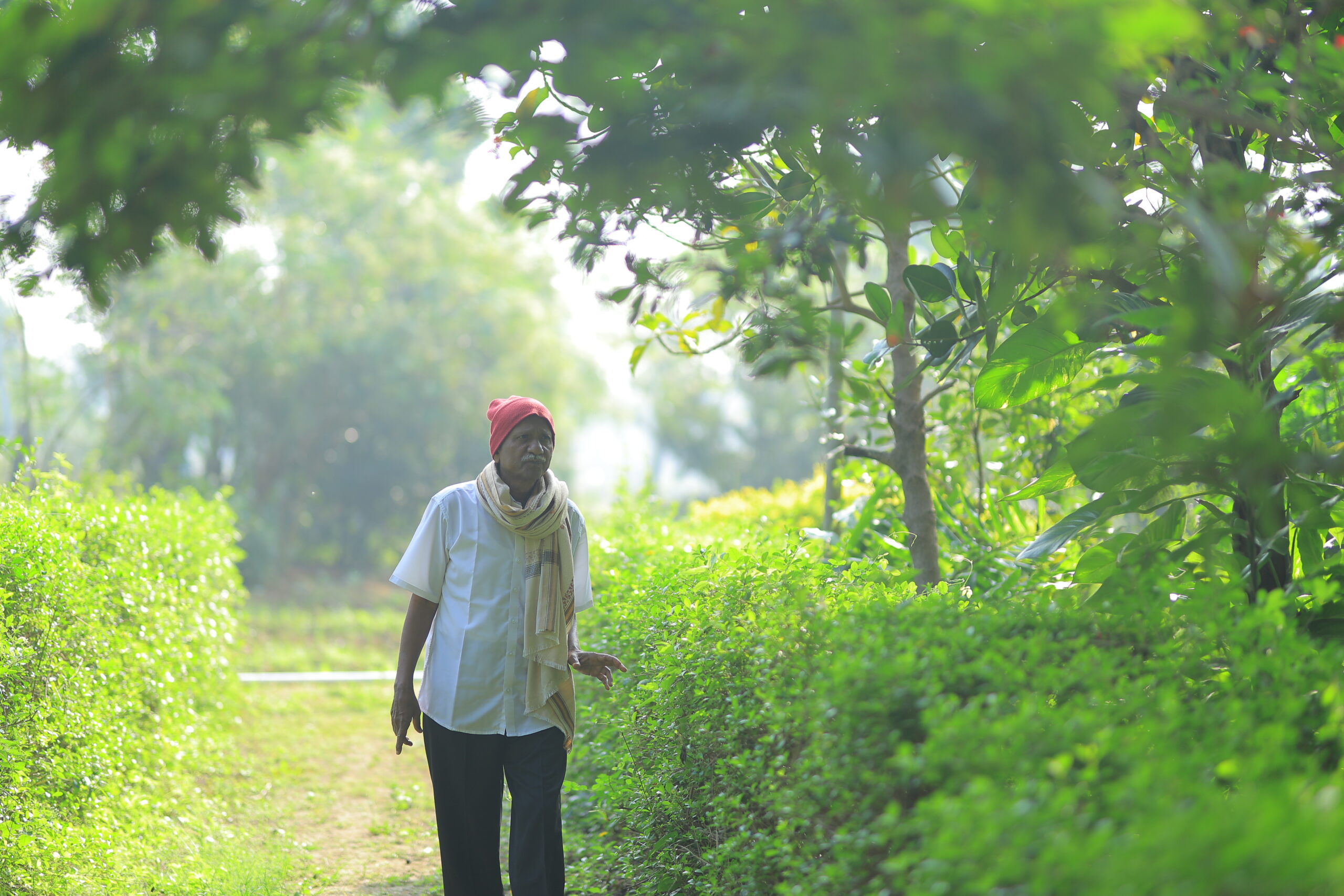 The founder's personal journey — from witnessing farmer debt in his banking career to transforming barren land into a model organic farm in Vellore.